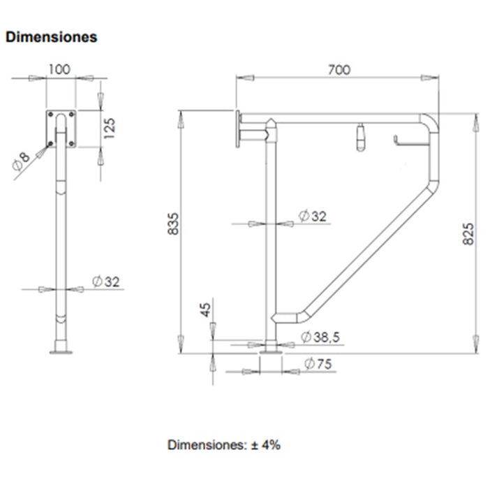 - BARRA ABATIBLE: fabricada con tubo de acero inoxidable AISI 304 acabado satinado, de diámetro exterior 32 mm, doblado en forma trapezoidal y sus dos extremos soldados a la columna vertical de acero inoxidable AISI 304 de diámetro 32 mm. Las zonas de agarre de la barra están granuladas para mejorar la adherencia del usuario. Incorpora un gancho porta-rollos de 120 mm de longitud fabricado con varilla de acero inoxidable AISI 304, de diámetro 6 mm.