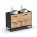 Magnífico mueble de baño para 2 lavabos. Dos combinaciones de color roble e imitación mármol que añadirán a tu cuarto de baño un toque industrial y elegante. Tiene un compartimento con puerta abatible donde podrás guardar toallas , productos de higiene....Una estructura inferior con patas y perfiles de ABS imitando hierro dan un toque exclusivo a este mueble.Guías metálicas en los cajones Pistones en puerta superior Tiradores de plástico ABS negros Estructura inferior de plástico ABS. Altura patas: 14 cm NO se incluye grifería Material: aglomerado de partículas y melamina de alta densidad Necesita montaje. No se incluye las siguientes herramientas: destornillador, martillo, cinta americana, metro...