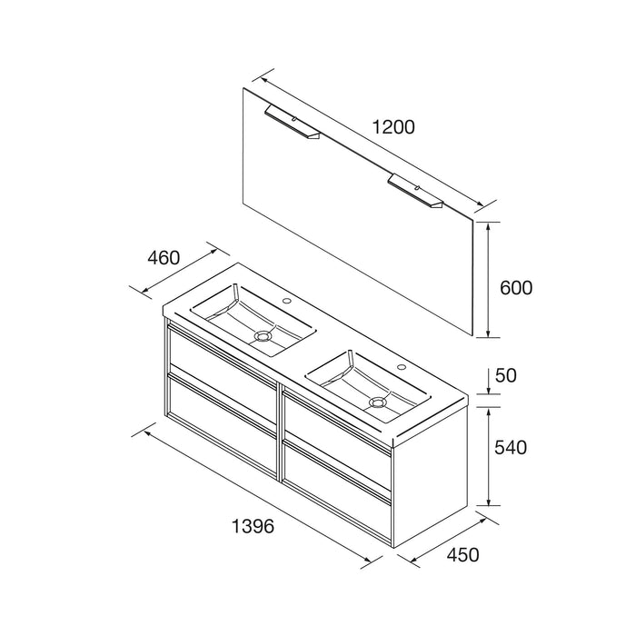Conjunto completo mueble de baño ATTILA 140 cm de Salgar está formado por dos muebles suspendidos con dos cajones con cierre amortiguado, lavabo de carga mineral blanco doble con senos integrados, espejo y apliques LED.