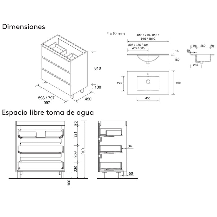 Disponible versiones de 2 cajones, 3 cajones y 2 puertas. Posibilidad de elegir mueble con lavabo integrado de encimera o mueble con encimera sin lavabo. Multiplica las posibilidades, haciendo la colección mucho más flexible.