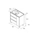 Mueble de baño de 3 cajones de extracción parcial con cierre amortiguado de guías HETTICH y 1 puerta con interiores acabado gris onyx antracita. Tirador tipo uñero integrado en el mueble. Frente y laterales fabricados en tablero de partículas laminado de 16 mm (clase E-1) con cantos PVC + cola PUR.