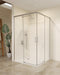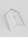Mampara angular de platos de ducha rectangular, compuesta por dos hojas fijas a la pared y dos puertas correderas sin rodamiento en la parte inferior, que facilita la limpieza y accesibilidad. Apertura desde el vértice.
