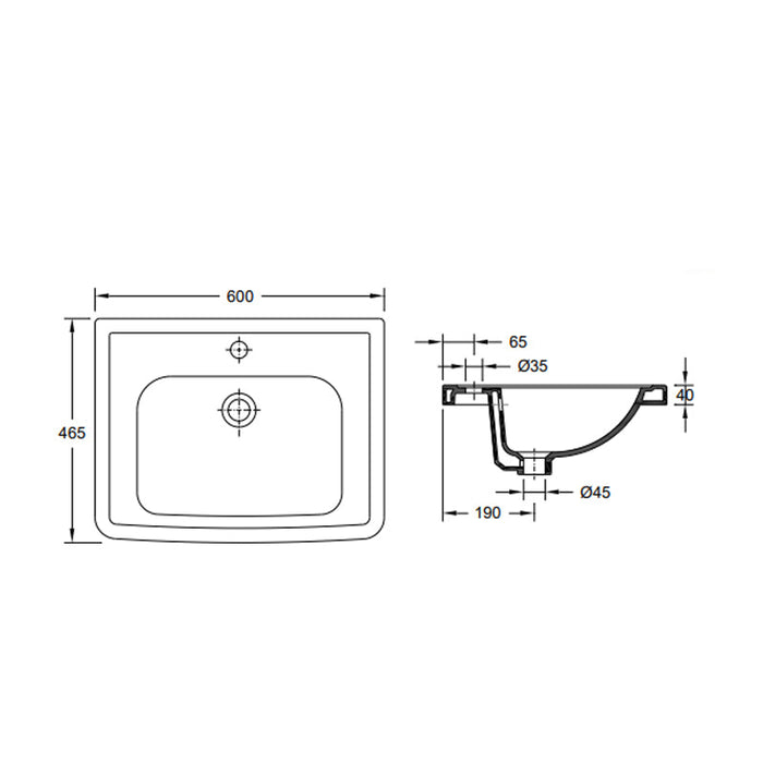 Lavabo de diseño clásico para encastrar en encimera, fabricado en porcelana sanitaria.