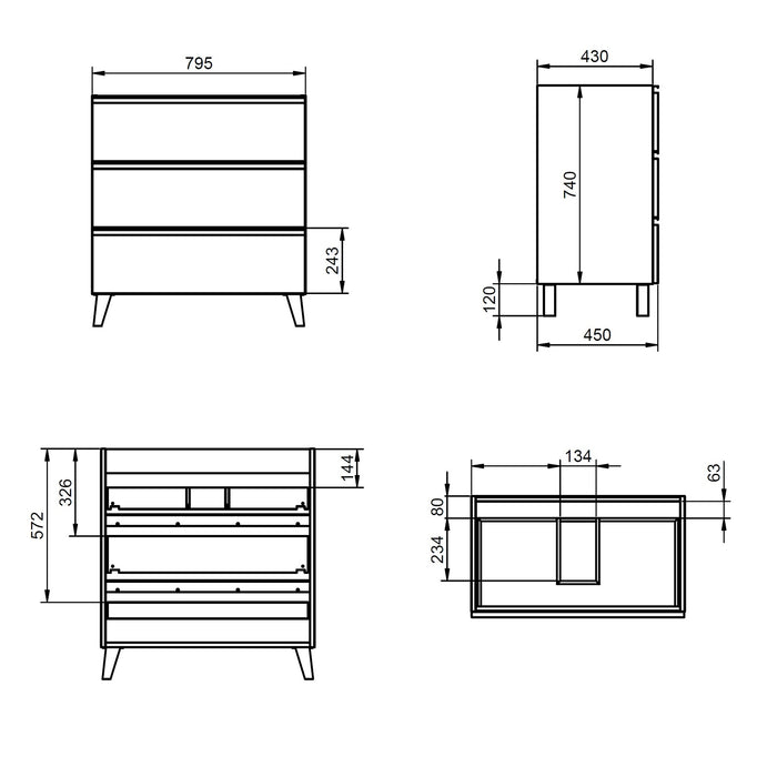 Mueble de baño con patas a suelo de 3 cajones con cierre Soft Close de cierre amortiguado y extracción total con sistema de autocierre y con interior textil. Cajón superior con organizador.